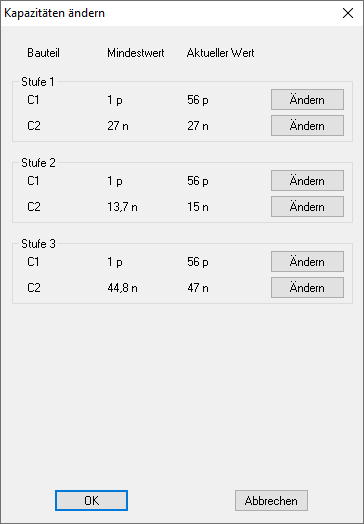 In diesem Beispiel ändern wir C1 in Stufe 1 und 3 auf 56 pF. Dabei muss auch C2 angepasst werden. Das Programm gibt jeweils den Mindestwert von C2 aus und schlägt ggf. einen neuen Normwert vor. Nach der Bearbeitung der Kapazitätswerte einer Stufe kommen Sie automatisch wieder zu diesem Dialog. Sie können dann die Kapazitätswerte weiterer Stufen bearbeiten. Haben Sie für unser Beispielfilter mehrere Werte geändert, könnten die Kapazitätswerte nach allen Änderungen z.B. wie folgt aussehen: